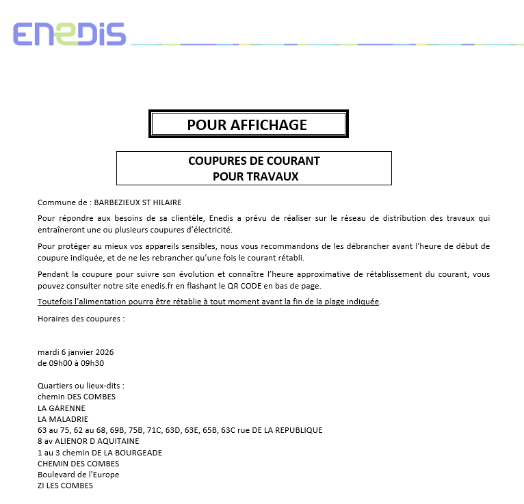 Pour répondre aux besoins de sa clientèle, Enedis a prévu de réaliser sur le réseau de distribution des travaux qui entraîneront une ou plusieurs coupures d’électricité.
