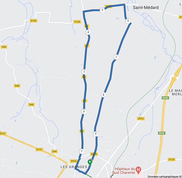 Avenue du Général de Gaulle, rue Turgot, avenue Vergne, avenue Vignola, route de Segonzac (RD1), commune de Saint Médard, route de Chez Baron et avenue du Général de Gaulle.