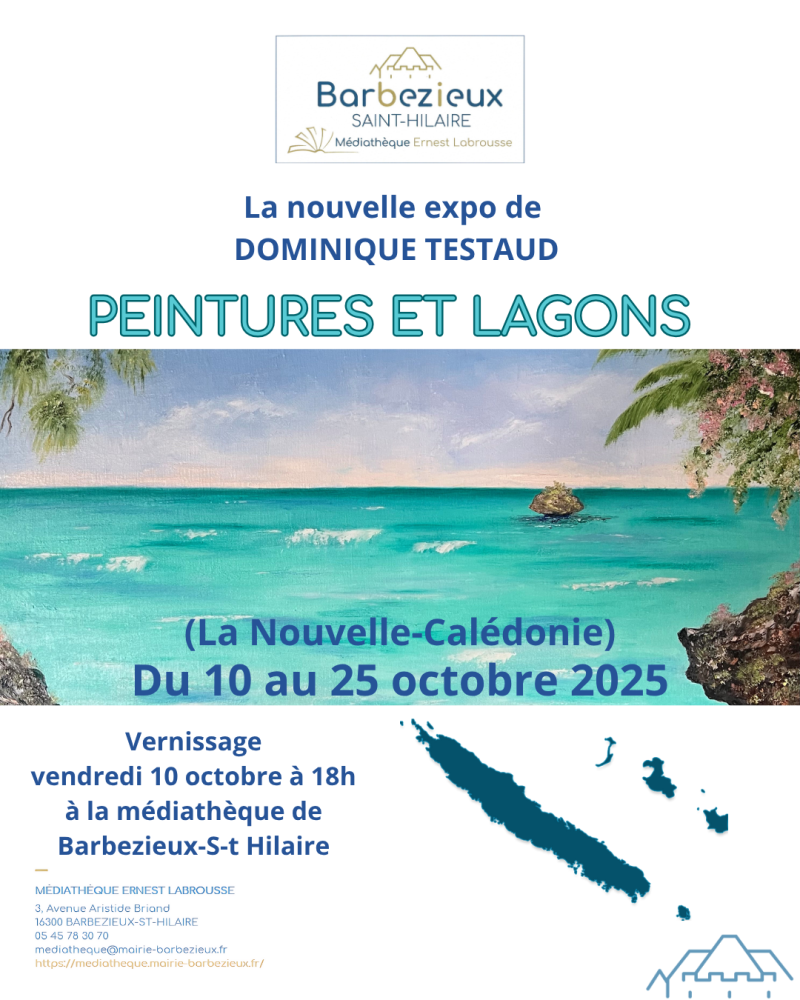 La nouvelle expo de Dominique Testaud à la médiathèque, »Peintures et lagons » nous transporte en Nouvelle-Calédonie.