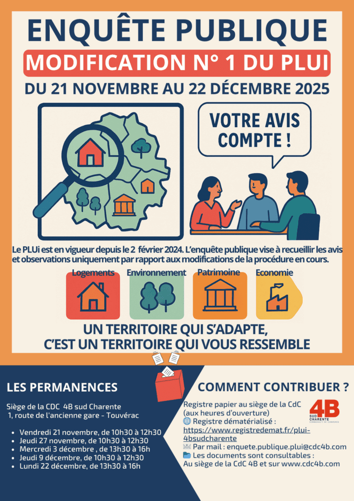 La Communauté de communes 4B sud Charente lance une enquête publique sur la modification n°1 du Plan local d’urbanisme intercommunal (PLUi), en vigueur depuis le 2 février 2024.