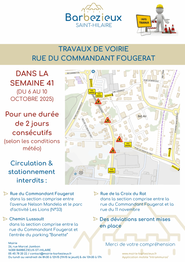 Des travaux de voirie sont prévus rue du Commandant Fougerat, pour une durée de 2 jours consécutifs, dans la semaine du 6 au 10 octobre.